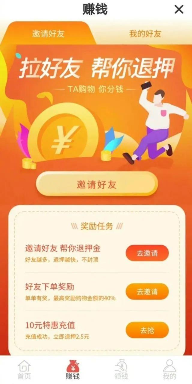 “拉好友,帮你退押金”活动显示:邀请好友越多,退押金越快,不封顶;“好友下单奖励”显示:单单有奖,最高奖励购物金额的40%;“10元特惠充值”显示:充值成功,立即退2.5元押金。