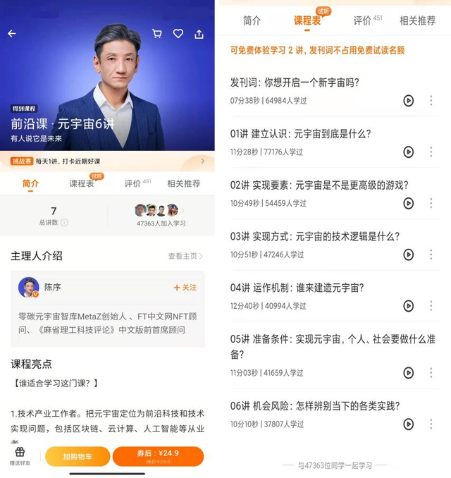 在罗振宇创办的知识学习平台得到App上,一门售价29.9元的《前沿·元宇宙6讲》课程成了热搜词。据课程介绍,这门课的主讲人名叫陈序,他一连串的头衔看上去很唬人:零碳元宇宙智库MetaZ创始人、FT中文网NFT顾问、《麻省理工科技评论》中文版首席顾问……