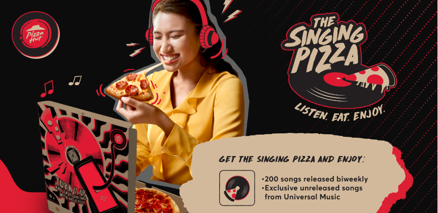 比如上述提到的必胜客“Singing Pizza”活动,活动为期九个月,Tuned Global为马来西亚必胜客创建了包含不同类型音乐的流媒体歌单,将原本普通的披萨盒变成了一个音乐盒,消费者扫码即可收听。这种以音乐为桥梁的沟通形式很大程度上弱化了活动的商业营销气质,以一种隐性广告的形式帮助必胜客与消费者建立情感连接。