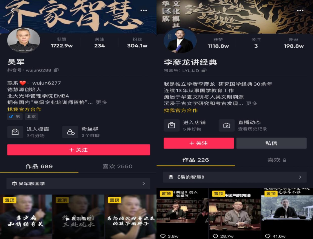 从讲解风水界的个体抖音账号看,“吴军”、“李彦龙讲经典”粉丝分别304.1w、198.8w,视频总点赞量分别1722.9w、1118.8w。