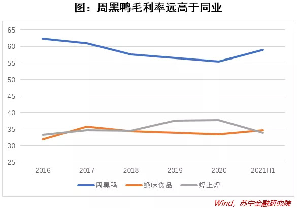 事实上,卤味赛道如此火热,其毛利率也确实不低。2021年上半年,煌上煌毛利率为33.97%,绝味食品毛利率为34.61,而周黑鸭的毛利率则更高,达到59%。周黑鸭目前单店的年收入在300万人民币左右,这是什么概念?肯德基中国单店的收入大约100万美元,也就是600万人民币左右的样子。而周黑鸭的店面大小远远小于肯德基。
