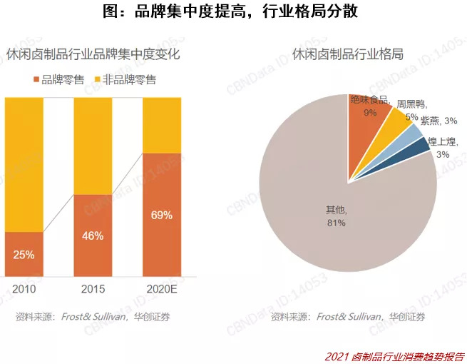 近年消费升级使传统行业加快规范化、品牌化的转化。卤味食品的品牌化从2010年的25%提升到了2020年的69%,看似进步明显。但我们看到反映市场集中度的CR5却没有明显的提升,这反映出行业内依然缺乏具有绝对话语权的头部品牌,从另一方面来说也代表着更多初创品牌、区域品牌可以突出重围,寻求更大的发展。
