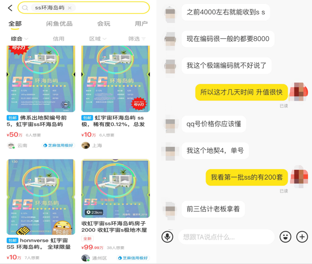 很快,被抢走的虚拟房产出现在了某二手交易平台上。一位卖家出售地契编号为5的虹宇宙SS环海岛屿,和编号20的地契,已经叫价至50万。另一卖家同样的SS级环海岛屿,标价达99.99万元。