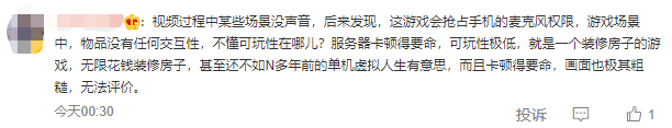 “视频过程中某些场景没声音,后来发现,这游戏会抢占手机的麦克风权限,游戏场景中,物品没有任何交互性,不懂可玩性在哪儿?服务器卡顿得要命,可玩性极低,就是一个装修房子的游戏,无限花钱装修房子,甚至还不如N多年前的单机虚拟人生有意思,而且卡顿得要命,画面也极其粗糙,无法评价。”有过亲身体验的某位大V,发表了以上评价。