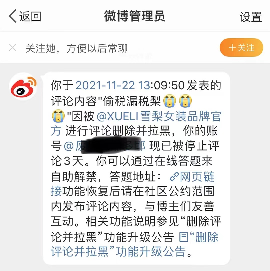 在偷逃税风波发生后,雪梨依然使用了一贯的控评手段。不少网友发现,只要对雪梨和林珊珊的微博评论偷逃税相关字眼,就会被删评并拉黑处理。“雪梨今天拉黑删评删得过来吗?手怕不是要断了。”有微博网友如此嘲讽道。