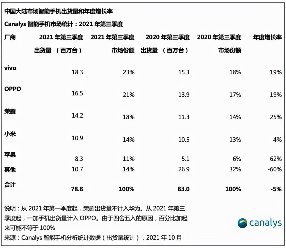 Canalys发布2021年Q3中国手机出货量数据