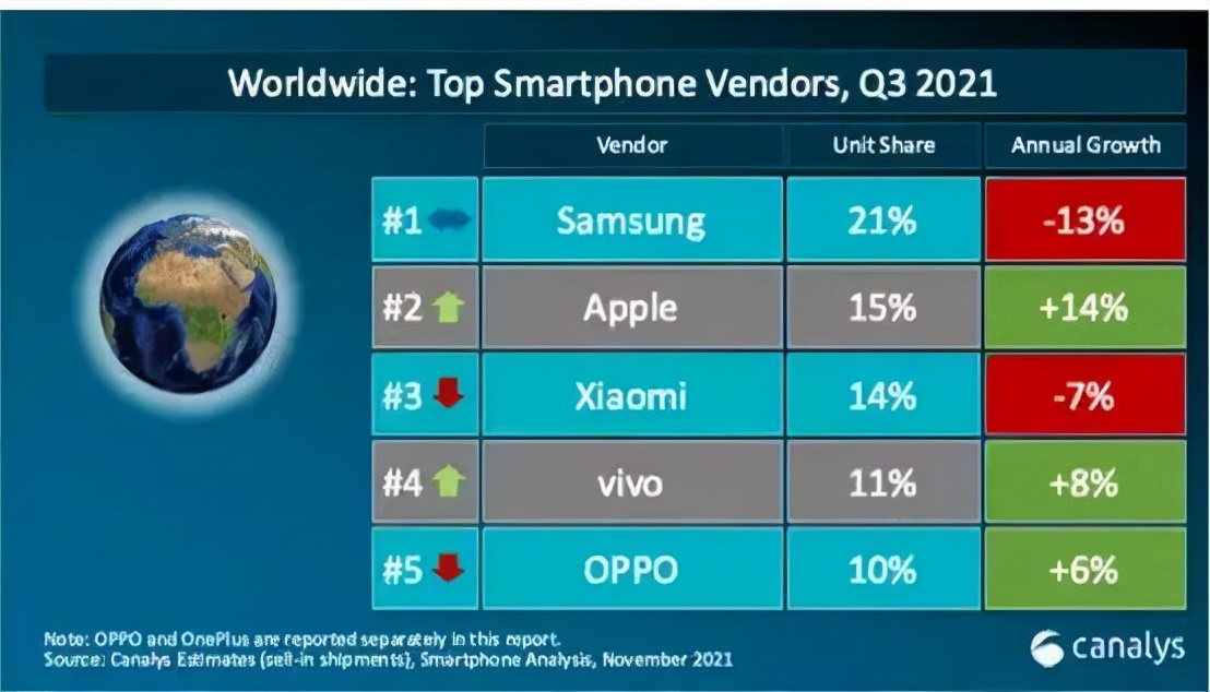 Canalys发布2021年Q3全球手机市场份额数据