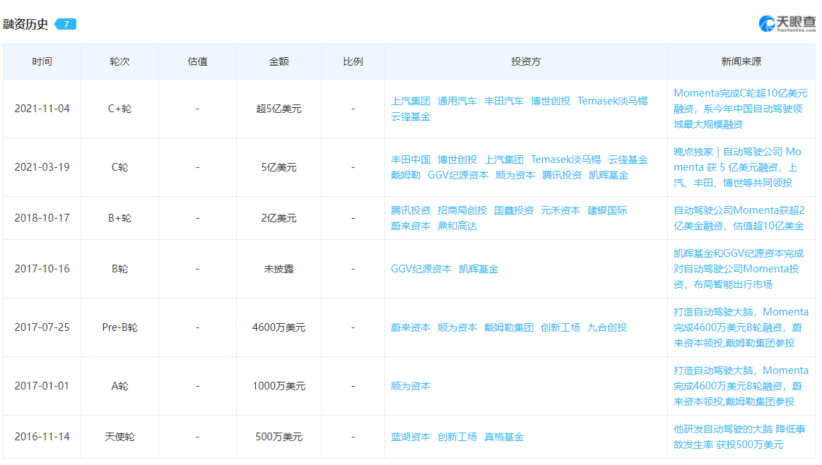 (天眼查数据:Momenta融资历史)