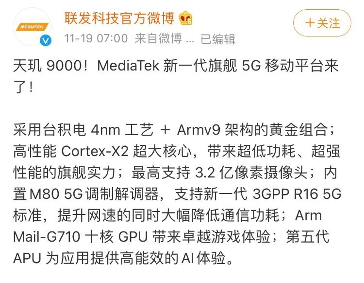 除了在发布时间上早于即将在今年12月1日发布的高通新一代骁龙8系旗舰芯片外,这款天玑9000在技术规格上也的确出彩,被外界认为是联发科高端旗舰的翻身之作。它是全球首个采用台积电最新4nm制程工艺的手机芯片。而此前,联发科一直没有能与高通旗舰级产品抗衡的高端产品。