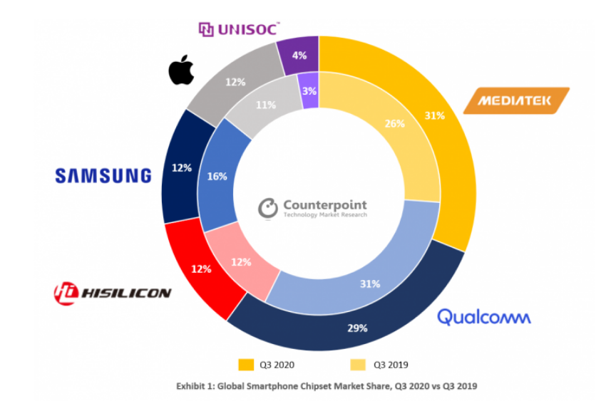 不难否认,高通给外界的印象一直是手机芯片供应商的领跑者,但实际上,高通早已坐不稳“一方霸主”的地位了。调研机构Counterpoint发布的报告显示,2020年第三季度,联发科在全球的市场占有率达到了31%,同时还预计联发科今年的市占率会继续上升到37%,这将高出高通6%。
