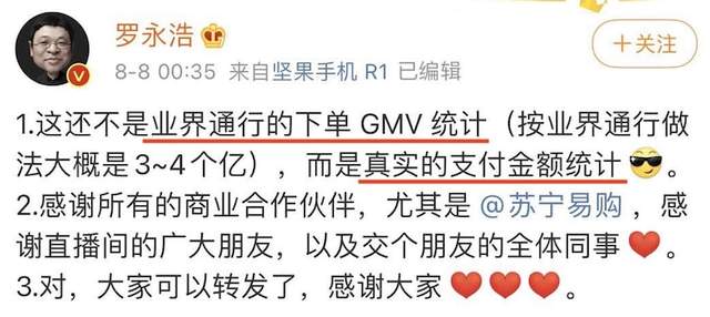 但罗永浩是个特例。按照他本人的说法,他直播间的官方战报是按照真实的支付金额计算GMV,即支付GMV,是指从下单GMV中刨去“未付款”部分。