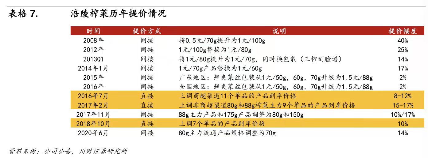 对于涨价原因,涪陵榨菜在投资者电话交流会中提到,公司本次提价是基于主要原料、包材、辅材、能源等成本持续上涨, 以及公司优化升级产品带来的价值和成本上升。公司产品出厂价调整后, 同时对终端售价进行指导,提价对终端的影响具有延续性,目前尚未反映出来。