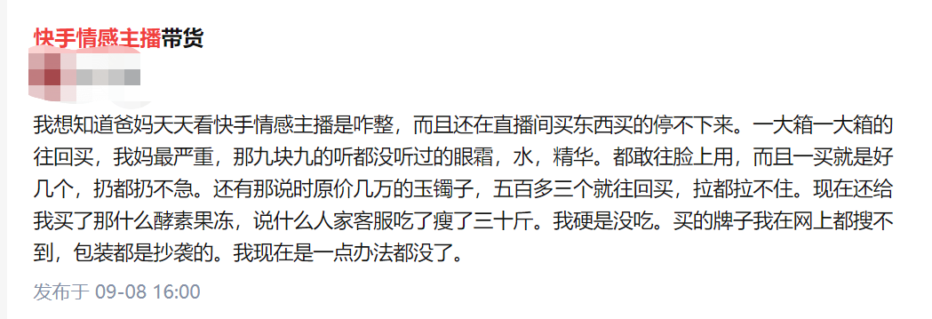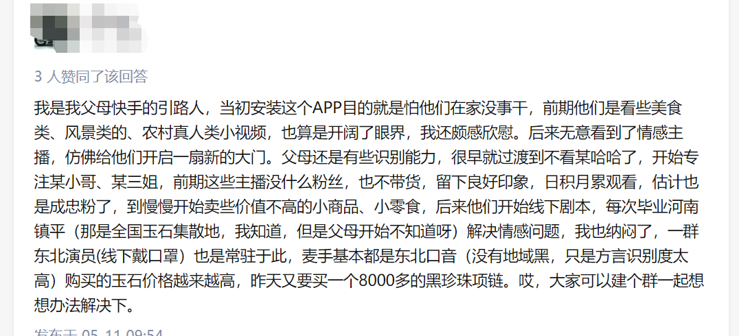 知乎上,有一个“如何让父母不再沉迷于快手情感主播”的话题,已经获得了3.3万的浏览。甚至有网友公开悬赏1万元征集线索,就为了让老妈早日看清这些打着情感调节幌子卖货的套路。