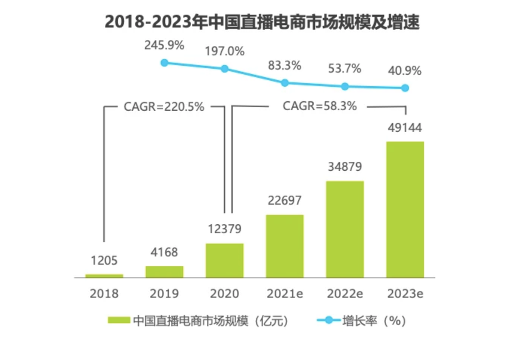 根据CNNIC的报告,自2020年下半年开始,电商成为用户规模最大的直播场景,目前占比超过60%,且仍在高速增长。根据艾瑞咨询的预测,2023年直播电商规模将超过4.9万亿,未来三年将保持58.3%的年均复合增长率,下单用户数、下单频次和客单价都将持续提升。