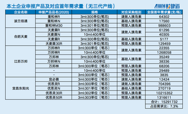这其中,浙江海正药业虽然参与了本次竞标,但此前并未出现在国采企业产品公示清单上(仅出现在首年需求量清单)。江苏万邦的两款二代预混人胰岛素,还并未获得正式商品名称。也就是说,它们是在未真正流通的情况下,先在集采前报量占位。同时,其预混人胰岛素(3ml:300单位,笔芯)与基础人胰岛素(3ml:300单位,笔芯)共享同一品名“万邦林”。