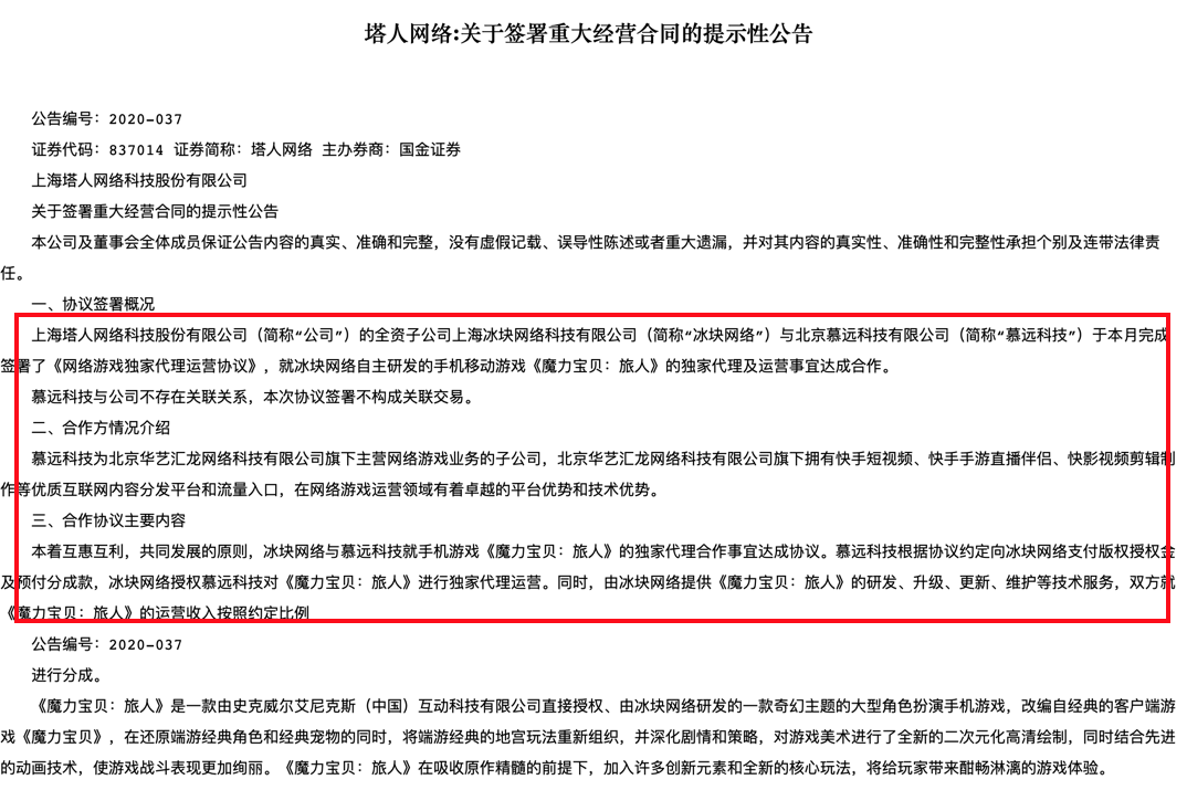 再看本次同IP新品《旅人》,其开发商塔人网络于2020年12月发布公告称,旗下全资子公司冰块网络与慕远科技签署了《网络游戏独家代理运营协议》,就冰块网络自主研发的手游《魔力宝贝:旅人》的独家代理及运营事宜达成合作。