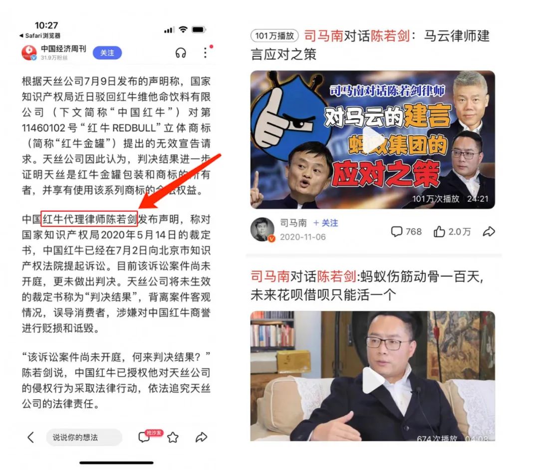 注:红牛代理律师陈若剑亦是司马南的朋友