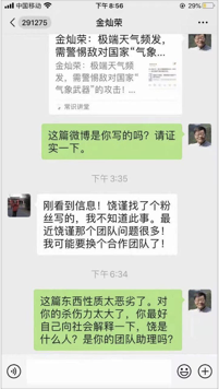 2021年夏天,当河南水灾肆虐时,金灿荣在其微博上公开宣称河南水灾源自美国气象武器,这种突破常识的指控引发舆论反噬,随后金灿荣不得不通过朋友辟谣,称相关内容为饶谨团队操作,其微博和微信公众号等也由饶谨团队运营,并提出要求更换合作团队。