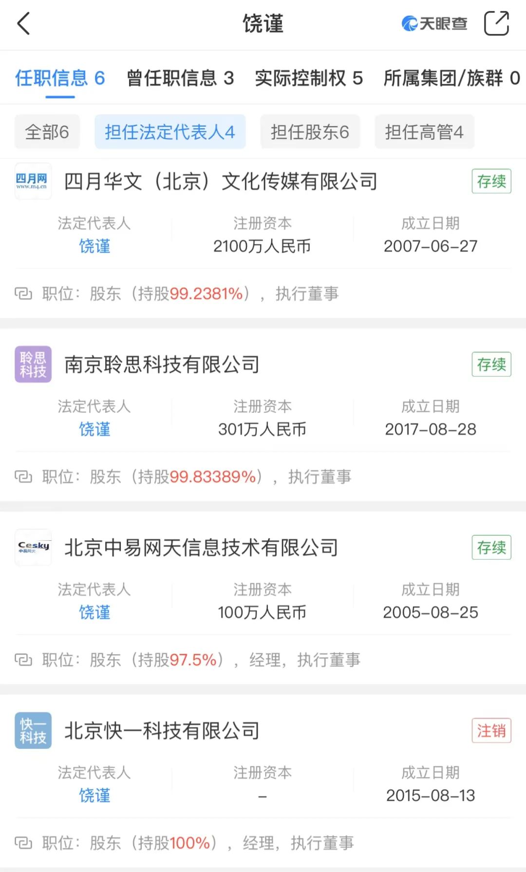 4天后,“北京中投国融金融信息有限公司”的股东饶谨在南京成立了聆思科技有限公司,2017年9月,南京聆思科技旗下第一个账号“政委灿荣”已经正式注册。这意味着,这位曾经的四月网创始人告别金融板块,重新回到自己熟悉的爱国流量生意上。