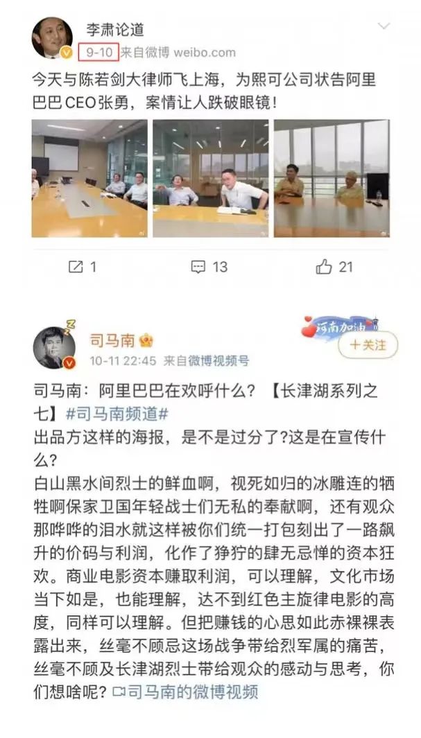 如果细看这位李肃的微博,会看到更有意思的一个巧合:2021年9月,李肃和律师陈若飞在上海面见了起诉阿里巴巴CEO张勇的原告方,10月,司马南在其多个平台发布视频《司马南:阿里巴巴在欢呼什么?》,指责阿里影业因为发布多张《长津湖》电影票房动态海报,就像是吃饭是吃到苍蝇,变成了“资本主义的狂欢”,并指责阿里高调数着钞票的时候没有顾及群众的感受。