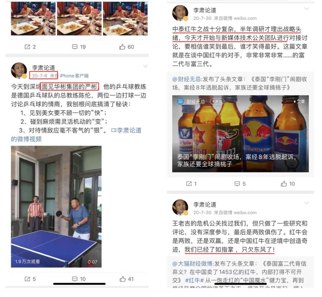 事实上,李肃、司马南和饶谨的合作并不是仅仅是在节目里谈古论今,在公关工作中更是亲密无间,2020年的“中泰红牛大战”就是三者的第一次合作。