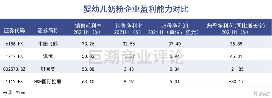 高端策略也带来了高盈利水平,今年上半年中国飞鹤实现营业收入115.44亿元,同比增长32.6%;归母净利润37.4亿元,同比增长35.85%。其各项盈利指标都远高于澳优、合生元、贝因美等同业公司。