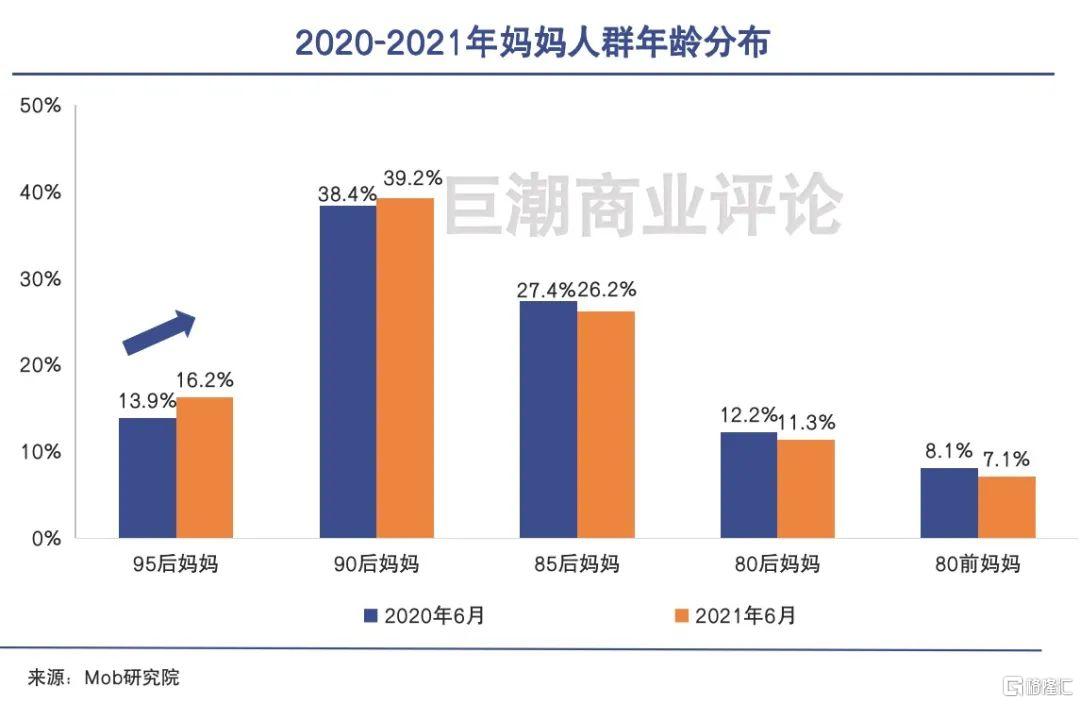 根据美柚和MobTech发布的报告显示,2021年妈妈人群中95后占比显著上升,由2020的13.9%上升至2021年16.2%。