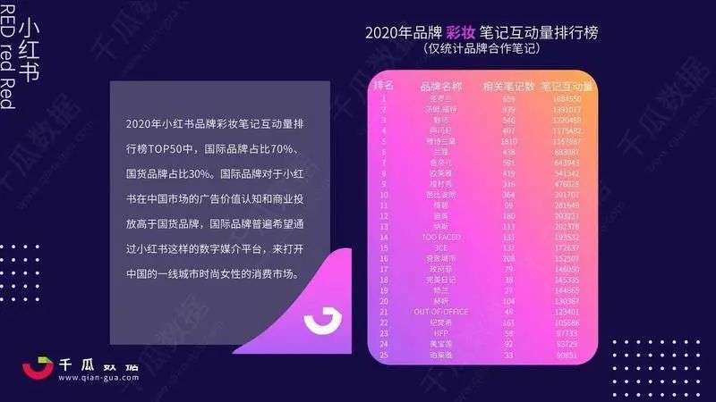 根据艺恩营销智库发布的报告数据显示,2019年,小红书13个热门品牌里,美妆品牌占小红书品牌投放和曝光的84.6%。根据千瓜数据公布的2020年小红书投放数据,雅诗兰黛、兰蔻等国际高端品牌一直牢牢占据笔记榜。大品牌雄踞,这很难在小红书上形成良性的品牌投放机制。
