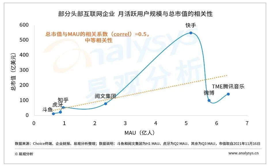 以部分头部互联网企业为例,通过对其MAU和总市值的相关性计算,可得出其相关系数为0.5,即呈现中等相关性,企业业务布局、用户质量、行业独占性等均影响资本市场对其的判断。对于投资者而言,不能通过单一用户指标决定企业价值,应在纵向上挖掘企业数据,并于横向上予以对比,进行企业分析。