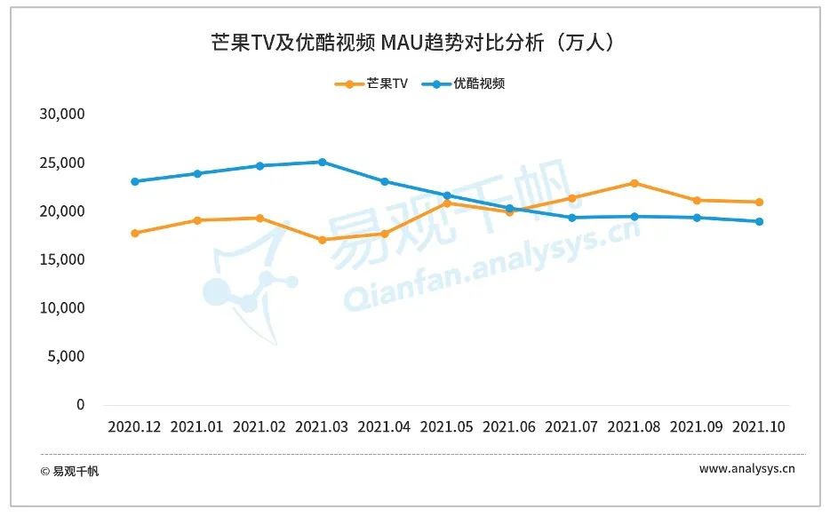 通过易观千帆,用户可获得以日、周、月、季为单位的App活跃用户表现及趋势,帮助投资者进行产品分析。以芒果TV及优酷视频为例,一方面,通过特定时间内MAU趋势分析,芒果TV月活跃用户数量稳步增长,并于2021年6月反超优酷视频。结合其产品独创的“视频连麦”以及率先推出的“0.25倍速观看”等功能,该平台的易用性有所增强,于综合视频行业中的竞争力也有所提升。