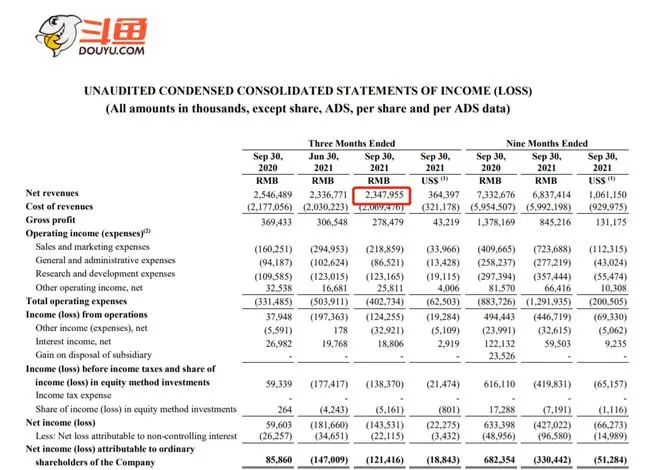 近日,斗鱼发布2021年第三季度财报,多项核心数据下滑。