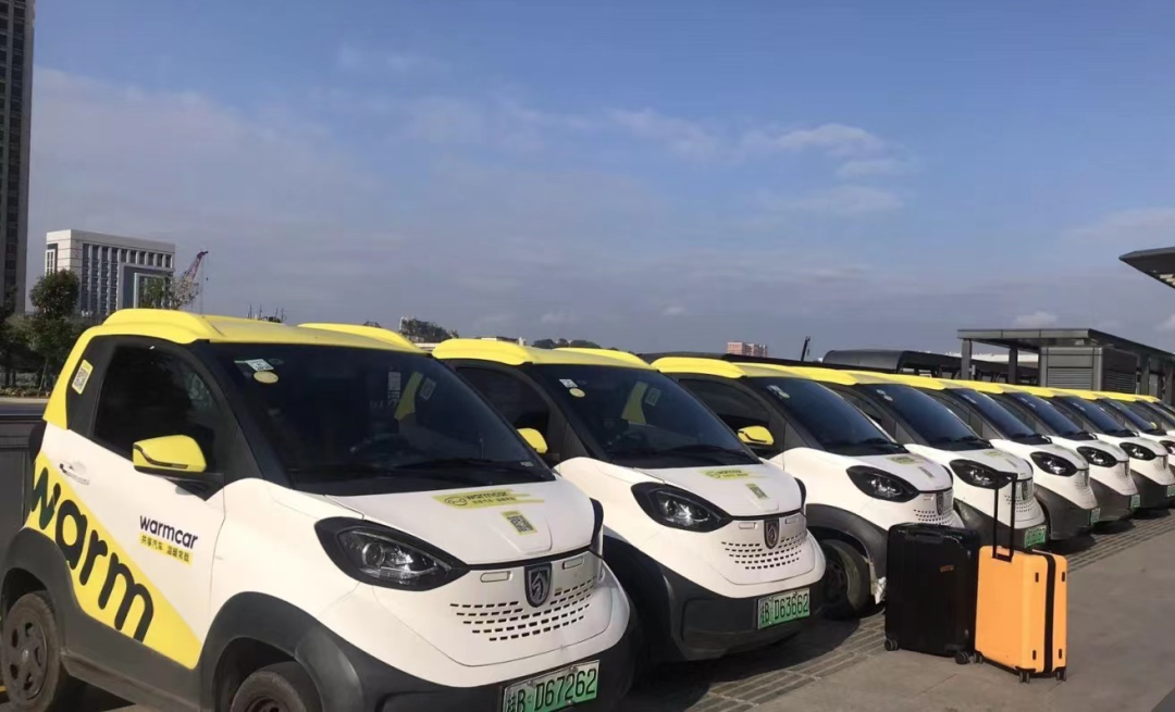 不过柳州拥有自己的公共自行车租赁,也有共享汽车WarmCar,也就是上图中那一排排黄白相间的宝骏E100,被当地居民称作“小E”。