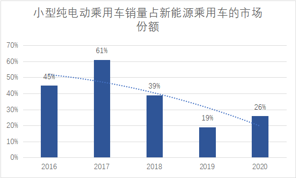 近些年来,在一、二线城市人们对于出行需求不断增高,低续航、低速的条件限制了其在大城市中的发展,因此微型纯电动车占比在2017年之后便呈下降趋势。