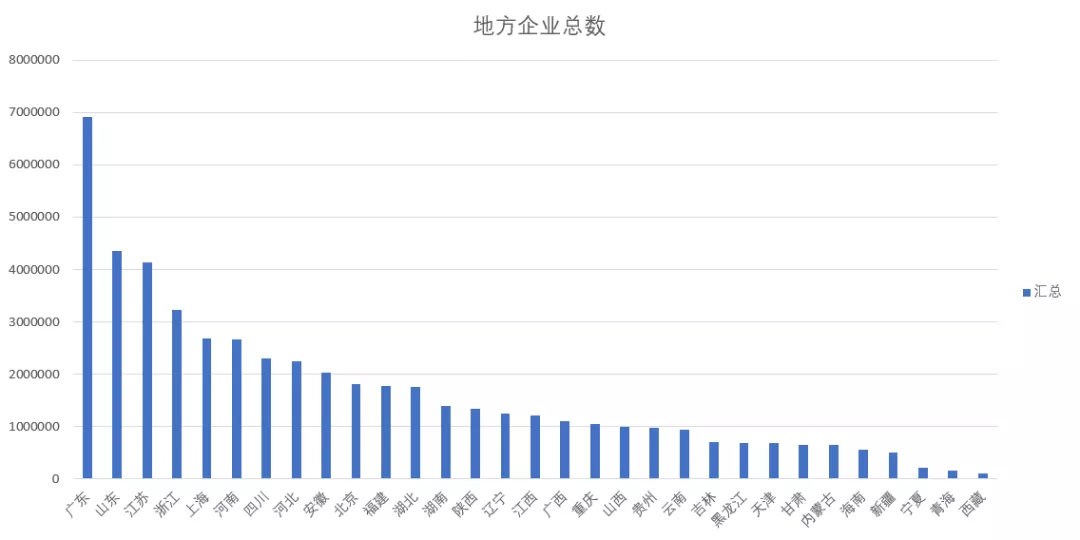 各省的企业总数也值得拿来进行一次比拼,结果就是广东省依旧是第一,其次是山东和江苏。