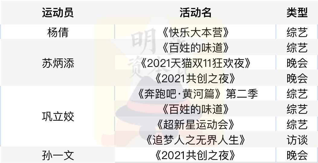 部分体育明星参加了综艺节目录制,杨倩连麦《快乐大本营》,巩立姣录制了《奔跑吧·黄河篇》《超新星运动会》《追梦人之无界人生》,苏炳添录制了《百姓的味道》,这些节目并未局限于体育竞技类,还包括美食和访谈类。