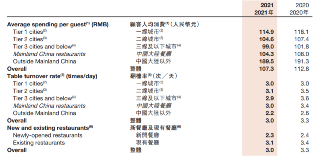从海底捞今年的半年报来看,整体翻台率显示逐年下降,2021年3.0次/天,2020年3.3次/天,2019年4.8次/天,2018年4.9次/天。