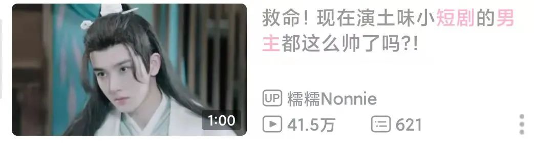 9月,一条名为《救命!现在演土味小短剧的男主都这么帅了吗?!》的影视混剪在B站获得了超过四十万播放量,视频里的古装男子面容英俊,剑眉星目,棱角分明,弹幕里飘过一片“帅”,在评论区里一位网友的发言更是获得近万点赞:“帅哥在拍土味小短剧,妖魔鬼怪在拍电视剧。”