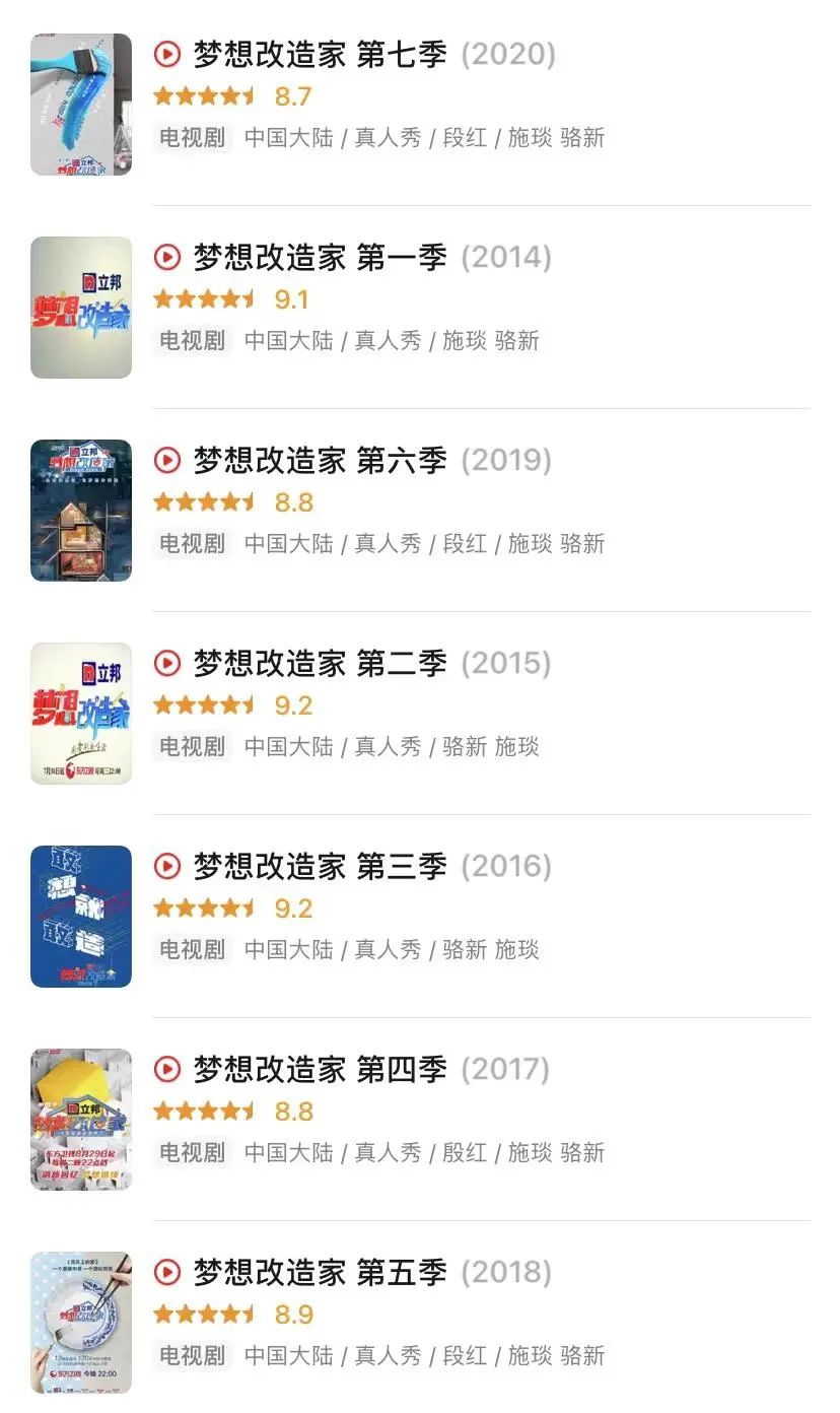 在红砖房事件之前,《梦想改造家》的节目口碑一直很不错。根据豆瓣评分,节目前三季均在9分以上,第四季至第七季也都在8.7分以上,被称为是家装改造类综艺节目的“天花板”。