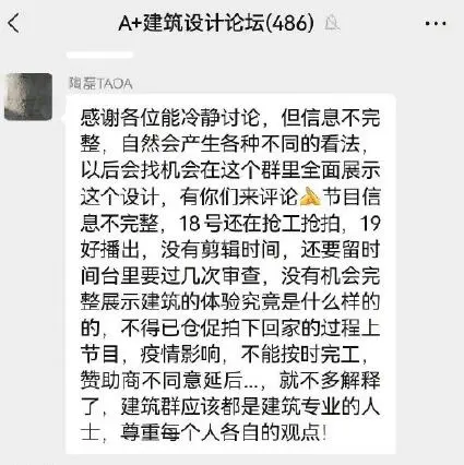 深陷舆论漩涡中心的建筑师陶磊,最后一条微博停留在节目播出前夕,目前已经积累了5万多条网友评论。网上流传着一张截图,内容是陶磊本人在同行交流群里解释称,目前节目展示的信息不够完整。