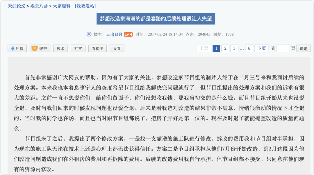 另一桩“悬案”发生在2017年初,一位曾参与《梦想改造家》第三季的业主在天涯论坛发帖,控诉房屋改造中的质量问题,表示设计与施工方面均存在缺陷。业主与节目组沟通不畅,双方各执一词,是非难辨。