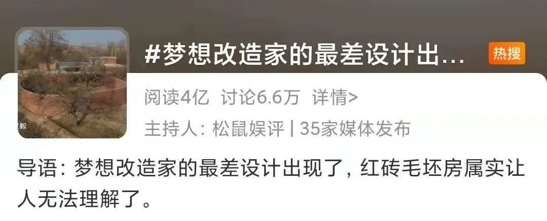 11月21日,话题“梦想改造家的最差设计出现了”迅速冲上微博热搜榜。节目组口中所谓“甘肃农村土房重建后变梦幻田园居”,在网友看来其实是“132万改造老屋成红砖毛坯房”,其中落差引发全网热议。![]()