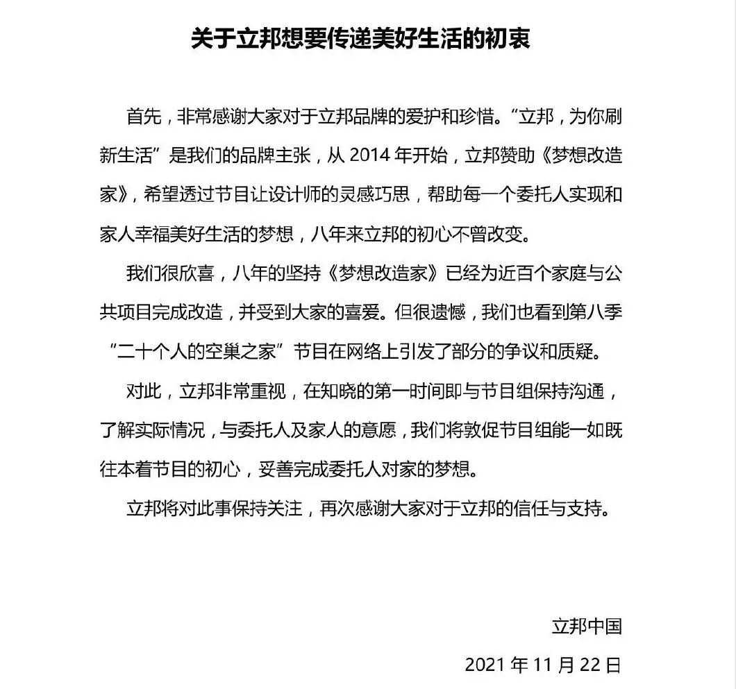 11月21日晚间,《梦想改造家》官方微博发布情况说明,致歉并表示节目拍摄时改造还未完工,节目组和委托人的子女们各承担一半费用。11月22日上午,节目赞助商立邦发布声明,将敦促节目组守住初心,妥善完成委托人对家的梦想。