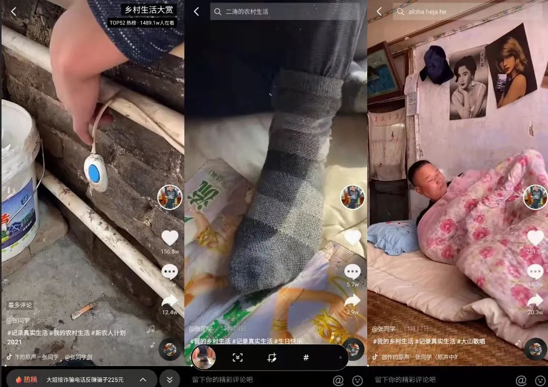 从抖音上一组简单的数据来看,在张同学视频日常添加的话题中,#我的农村生活 拥有125.9亿次播放,#新农人计划2021拥有684.9亿次播放,除此之外像拥有386.5亿次播放量的#记录真实生活 话题中,绝大部分视频也都是乡村题材的内容。