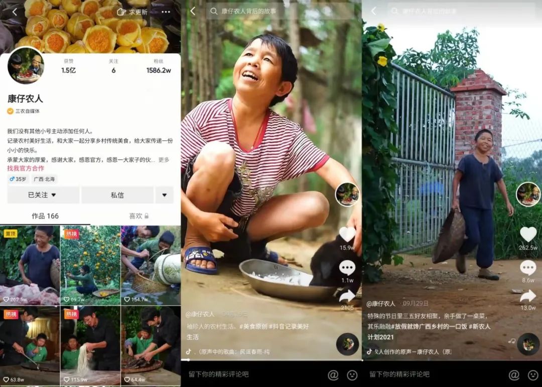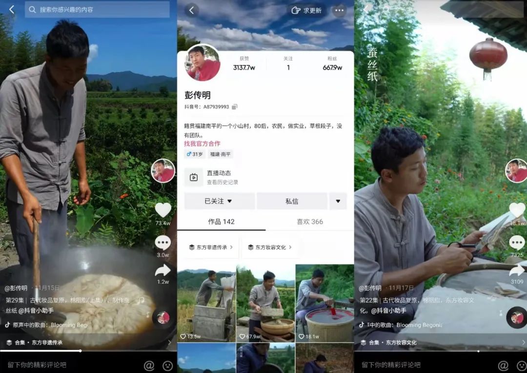 如今,彭传明已经更新了142个作品,收获3135.1万赞,拥有667.5万粉丝。而除了彭传明之外,在视频风格中同样受到李子柒影响的,还有康仔农人。