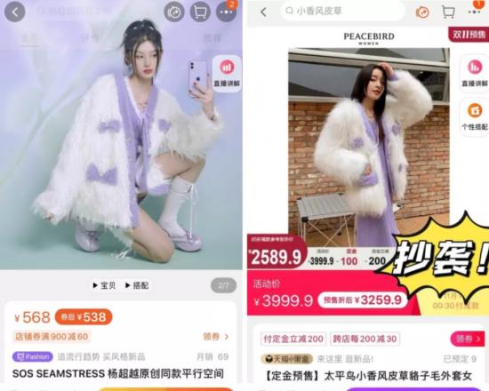 最近站出来指控太平鸟抄袭的是一家小众原创服装品牌,品牌名叫“SOS_SEAMSTRESS”。10月25日,SOS发文控诉:太平鸟1:1抄袭自家某一款服装,除了把滩羊毛改成貉子毛外,版型、颜色,甚至纽扣、蝴蝶结装饰的位置都一模一样,该话题很快登上微博热搜。