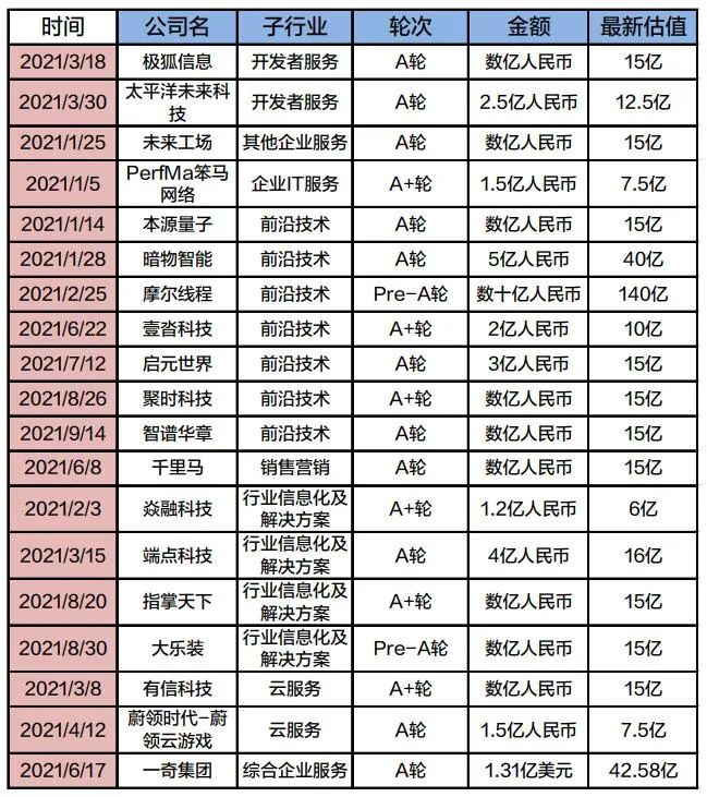 从整体来看,在400多起前期项目之中,获得高投资的企业大多都属于细分领域的“冷门”赛道。例如迅联云致力于发票数字化技术;领调云致力于市场调研数据服务;大乐装数亿元preA轮融资,聚焦于装配式混凝土建筑细分市场;极狐信息是代码托管平台......