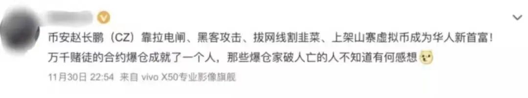 赵长鹏登顶华人首富消息出后来,有微博大V发文表示:“币安赵长鹏(CZ)靠拉电闸、黑客攻击、拔网线割韭菜、上架山寨虚拟货币成为华人新首富!万千赌徒的合约爆仓成就了一个人,那些爆仓家破人亡的人不知道有何感想。”