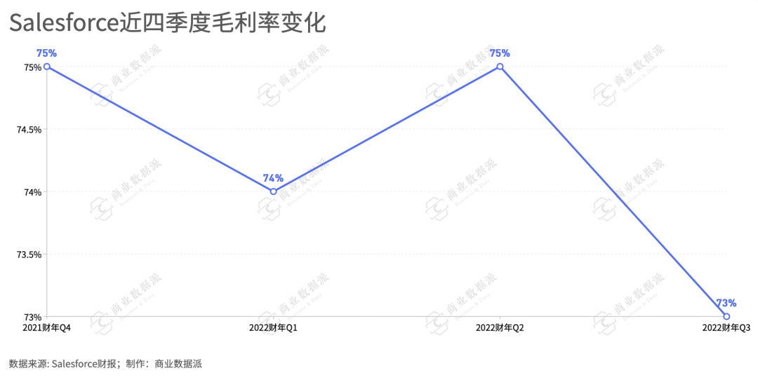 此外,SalesforceQ3毛利率为73%,去年同期为79%,近四个季度毛利率均超过70%。在较高水平且比较稳定。