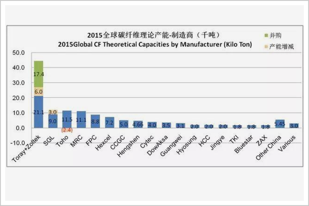 ▲2015年全球碳纤维理论产能,前五家公司分别为日本东丽、德国西格里、东邦、三菱和中国台湾的台塑 来源:《2015年全球碳纤维复合材料市场报告》