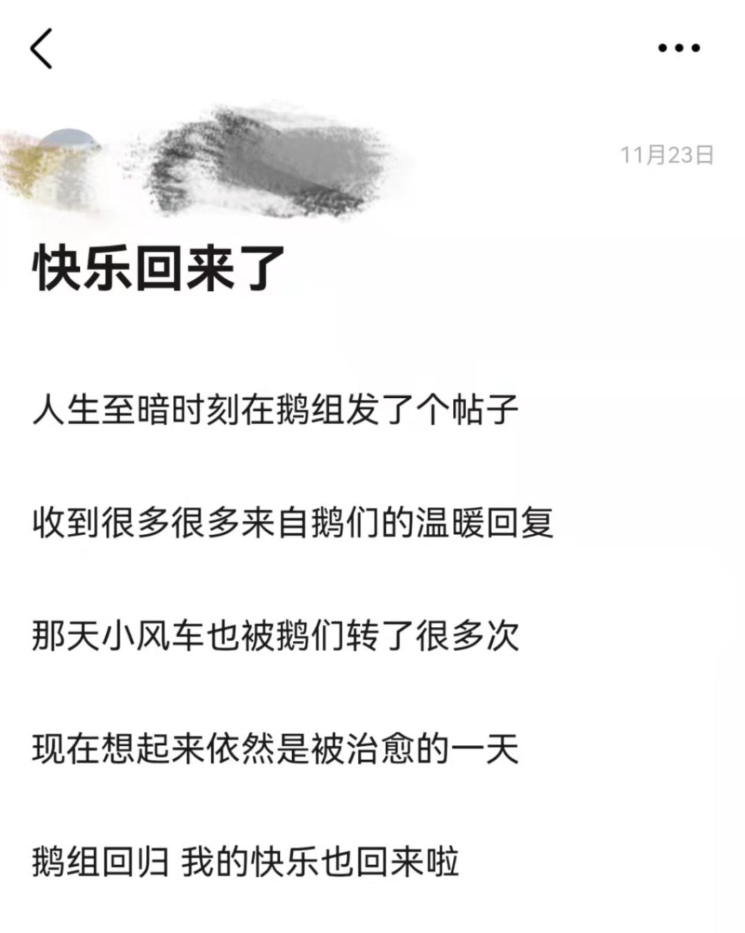 算上这次封禁,鹅组先后经历过四次整顿,每一次都会令组员感到不安。一有风吹草动,大家就会在组里发告别贴,相互表白,感谢彼此多年来的陪伴。